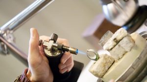 The vast majority of retailers use the casting method, which involves pouring molten metal into molds. The mold is created by first carving or 3D printing a wax model of the finished jewelry product. This model is then covered in plaster prior to being heated. The heat causes the wax to melt, which leaves space inside the plaster for molten metal to be poured in. Once the metal is cooled, the plaster is removed to reveal the piece of jewelry. It is then polished and set with any gemstones to complete the final design.