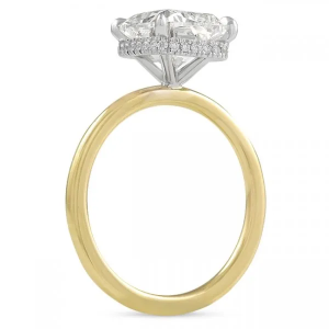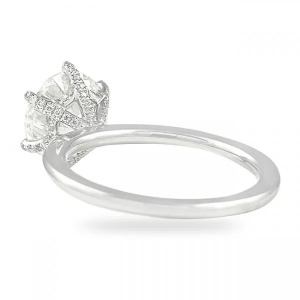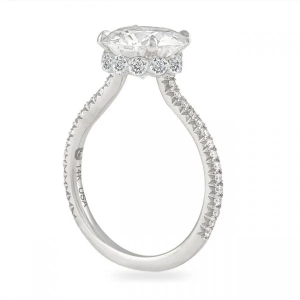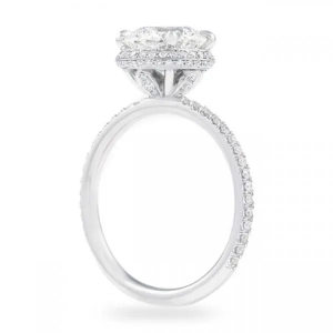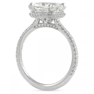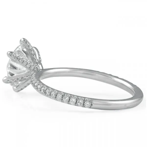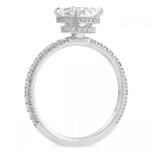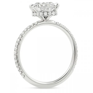 While other jewelers use this terminology to refer to a single wrap of diamonds around the prongs, our version of the Hidden Halo™ is a bit different. This signature style features two rows of pave diamonds concealed beneath the center stone with the top row peaking out every so slightly. As opposed to a regular halo that sits at the top of the center stone, our Hidden Halo™ sits at the center of the prongs, effectively giving the ring more depth.