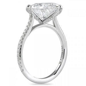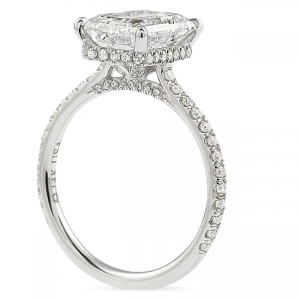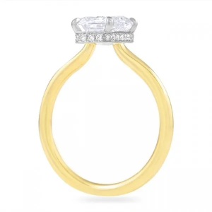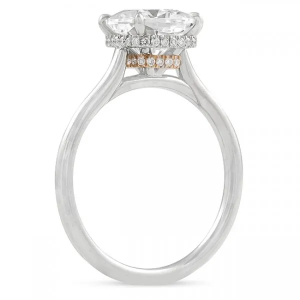 Our Invisible Gallery™ engagement ring is a type of engagement ring setting that has an open underside allowing for the center stone to sit as low as possible on the finger. These designs often feature a row of pave diamonds encasing the center stone from below for a touch of profile appeal and can be made with a halo as well.