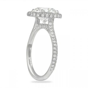 The Double Edge Halo engagement ring features two rows of diamonds surrounding the center stone; one row facing the top with the second row facing the side of the center stone.
